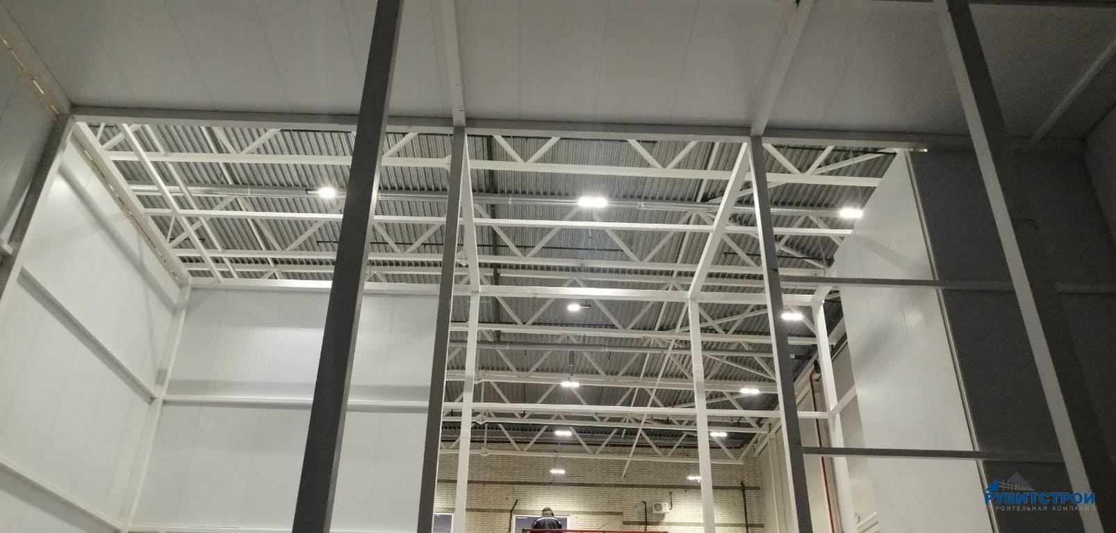 - Общая площадь зашивки стен, и перегородок из сэндвич-панелей 2400 м2 с заполнением из пенополиуретана. Общая площадь зашивки потолков: 1350 м2.