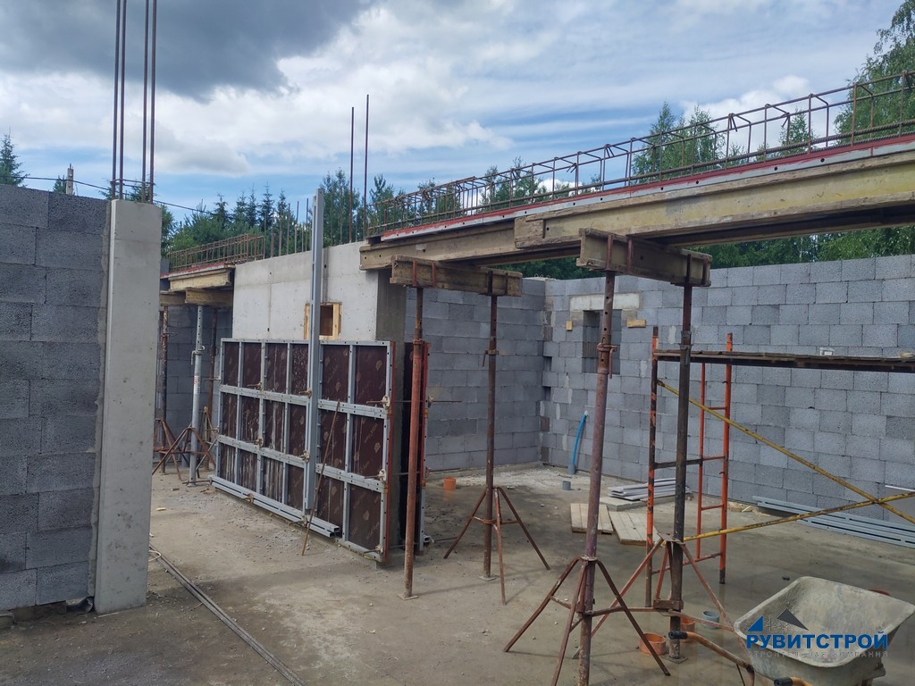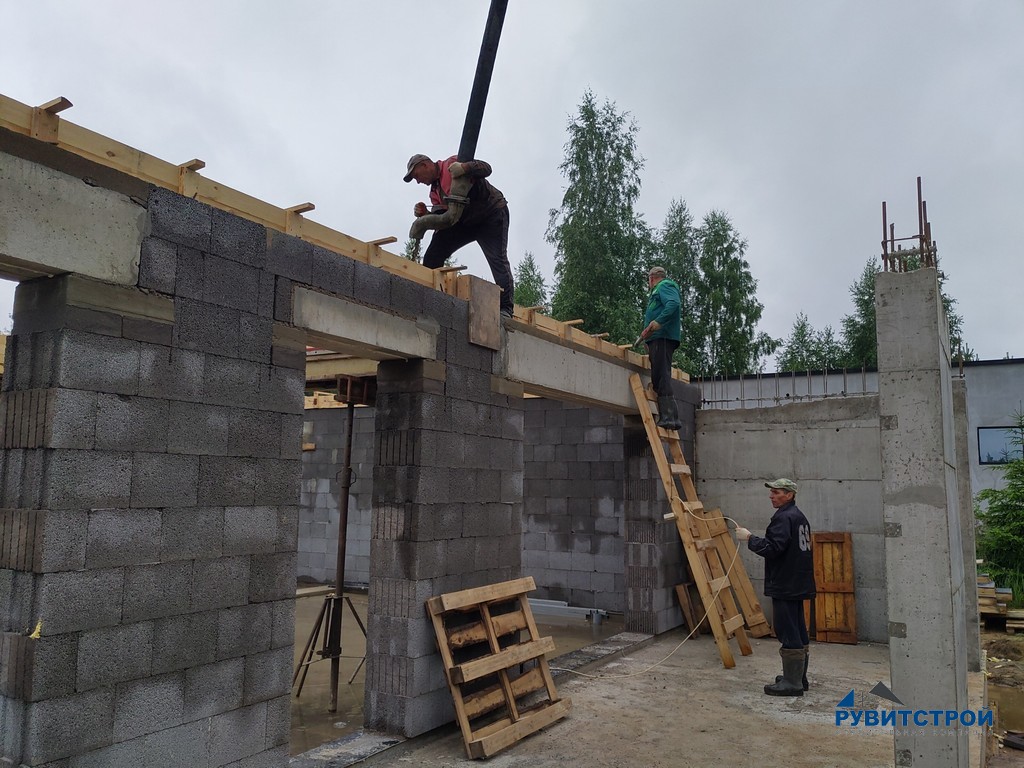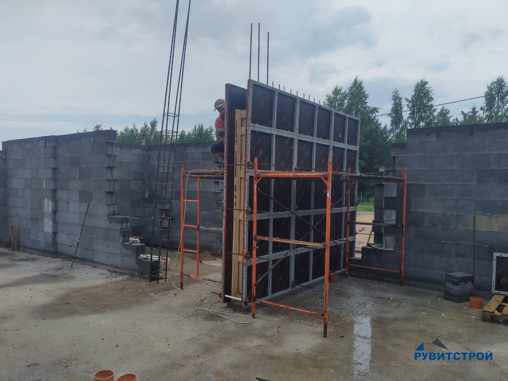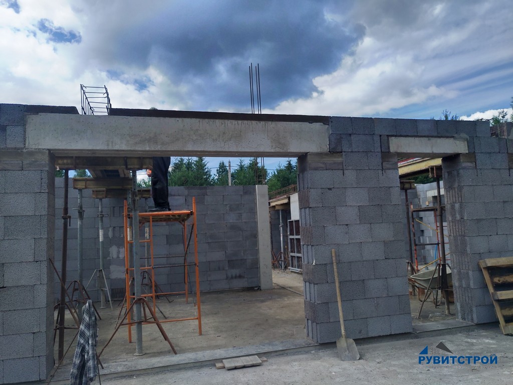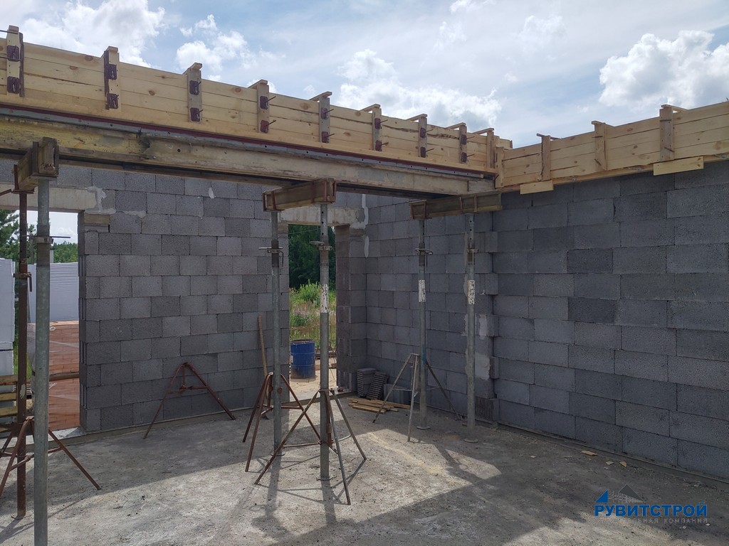 - Устройство монолитного железобетонного пояса, перемычек над окнами, балки, колонны